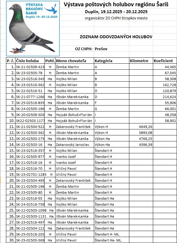 Oblastné združenie chovateľov poštových holubov v Prešove sa skladá z nasledujúcich klubov: Šarišské Bohdanovce, Lemešany, Solivar, Nižná Šebastová, Prešov, Bzenov, Malý Šariš, Veľký Šariš-mesto a Široké. Naším mottom je "vždy byť rýchlejší, vždy byť lepší!"